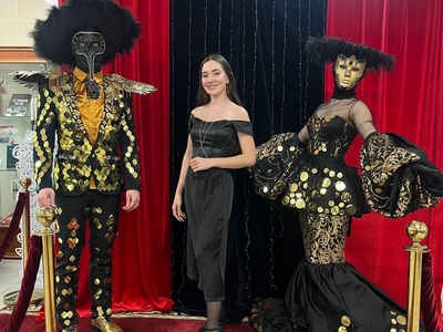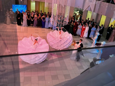 Тем временем звуки оркестра уже наполнили атриум Библиотечно-информационного центра СурГУ. На сцене атриума появились удивительной красоты танцовщицы в белоснежных платьях и замерли, словно статуи: им предстояло «ожить» в начале бала под прекрасную мелодию. И вот на паркет вышли танцующие пары. Они прибыли из разных муниципалитетов округа, чтобы побороться за титул Короля и Королевы бала.